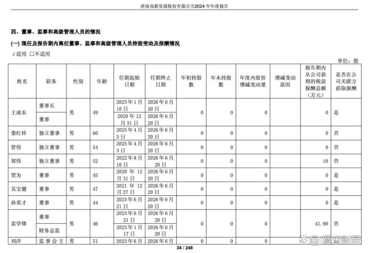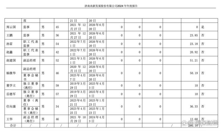 2024年年报显示,公司董事、监事和高级管理人员2024年报酬总额290.18万元。董事长、董事王成东2024年从公司获得的税前报酬总额为0,在公司关联方获取报酬。董事、财务总监雷学锋2024年从公司获得的税前报酬总额为41.90万元,未在公司关联方获取报酬。副总经理、董事会秘书杨继华2024年从公司获得的税前报酬总额为50.19万元,未在公司关联方获取报酬。